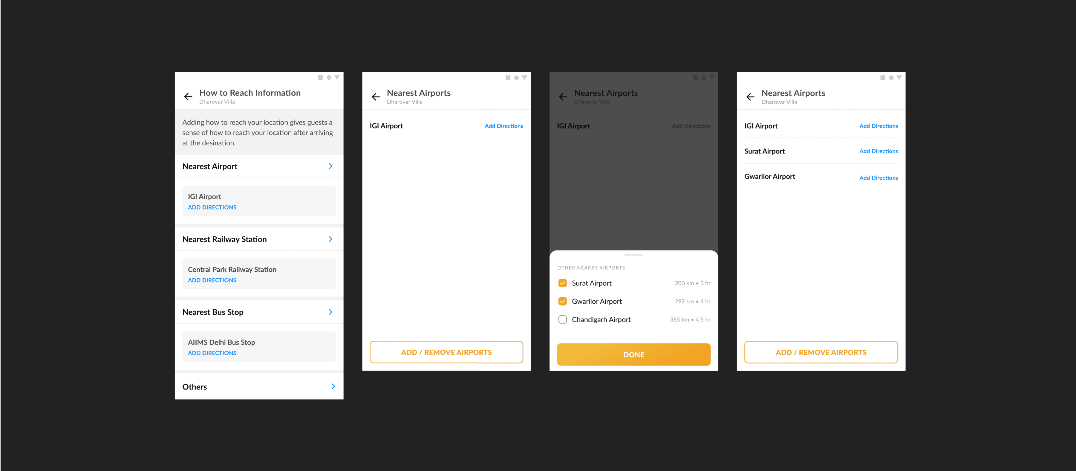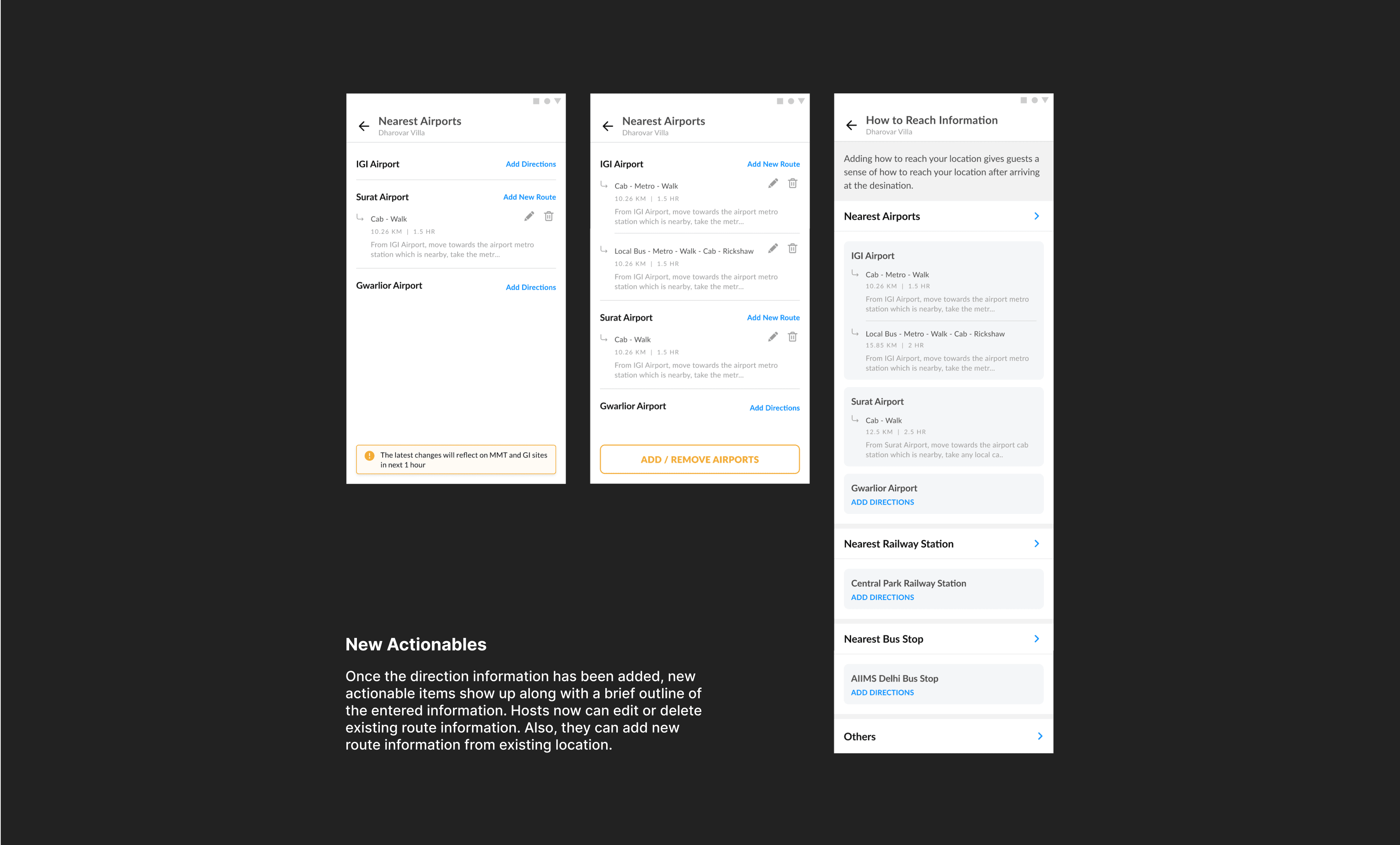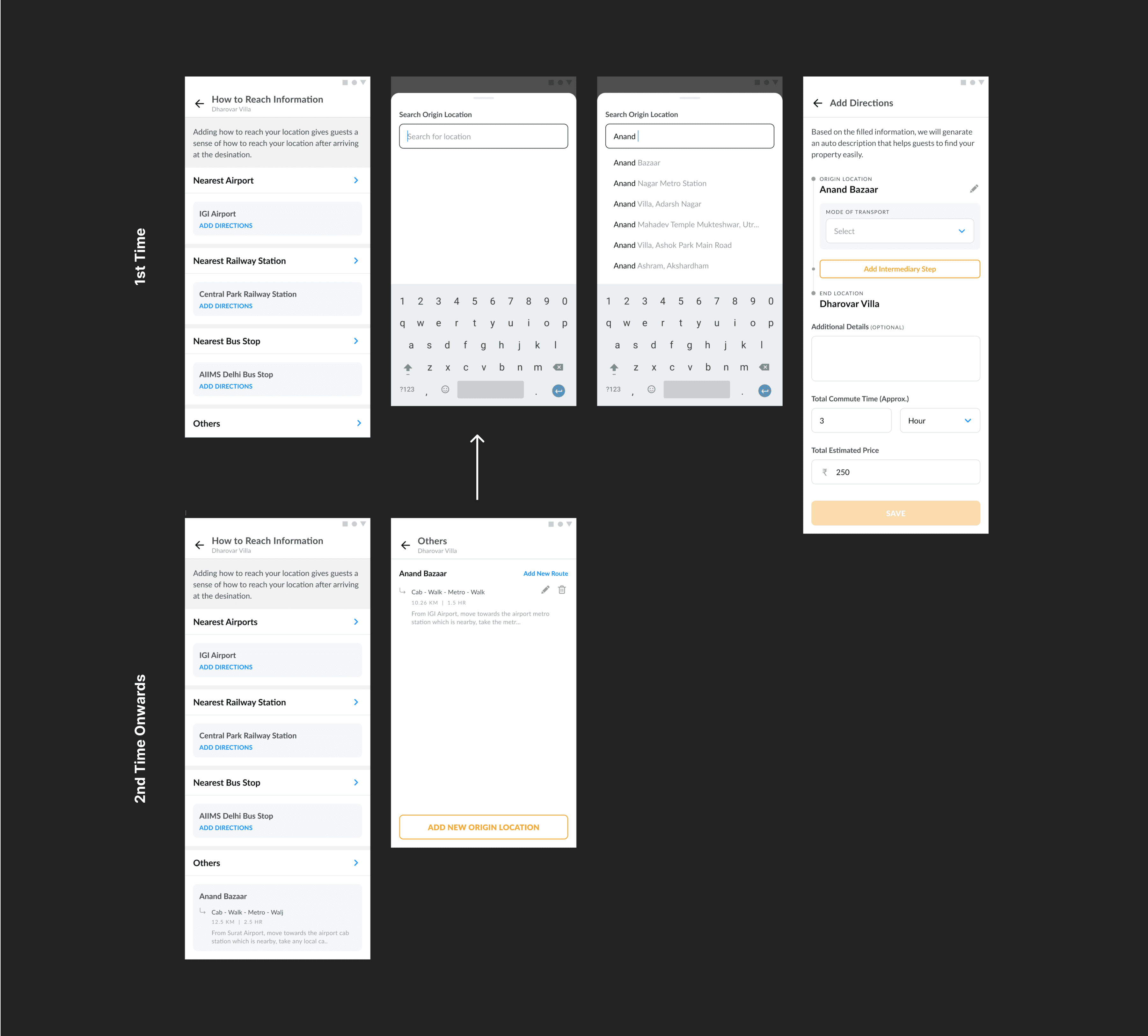 Often there are popular destinations nearby the property which cannot be categorized into airport or railway station or bus stop, but are helpful for visitors to reach their booked property. The 'Others' section caters to that use case. To smoothen the flow, first time users directly get the location search engine to list the popular destination. Whereas, users from second time onwards get a preview of the already saved popular locations before getting the location search engine.
