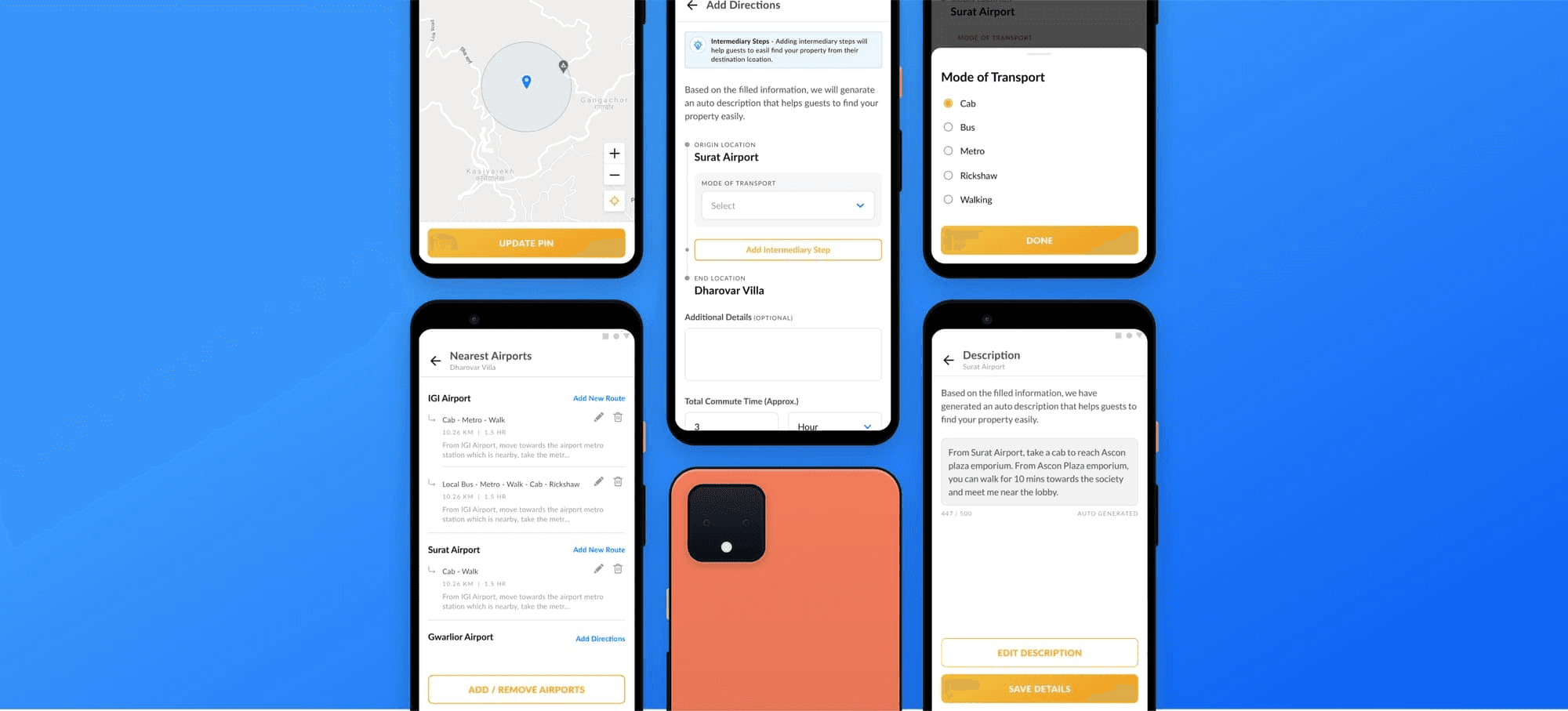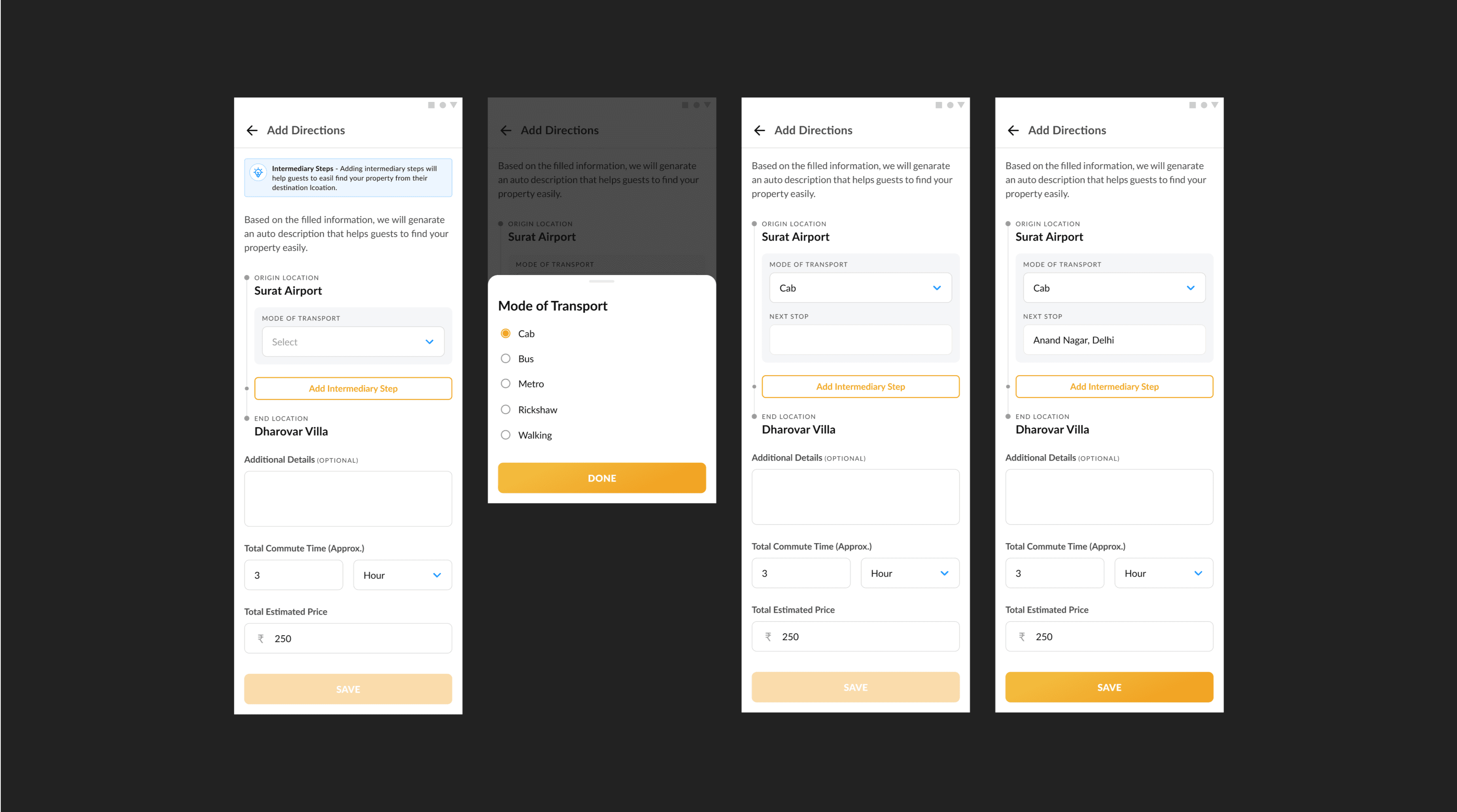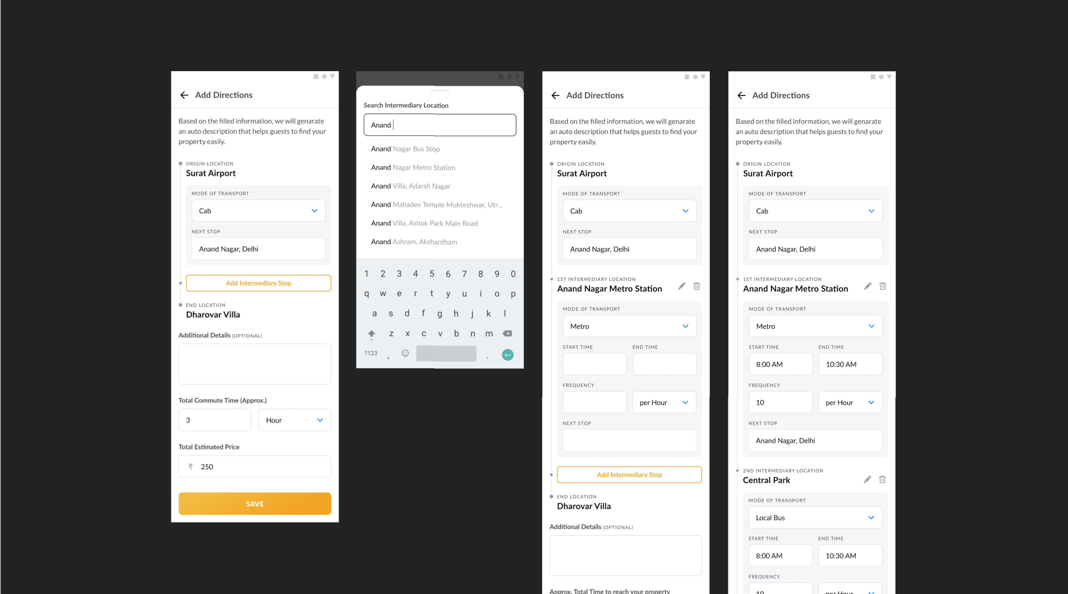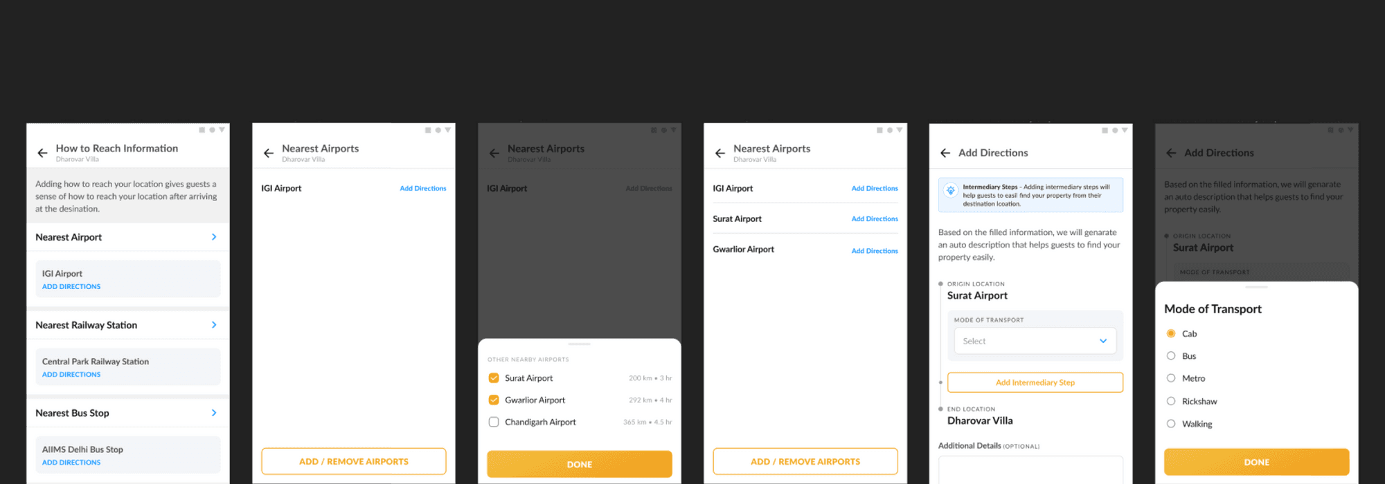 In the direction addition step, hosts can also add intermediary steps. This caters to the use case where visitors have to make multiple stops or change their medium of commute in order to reach the property location.