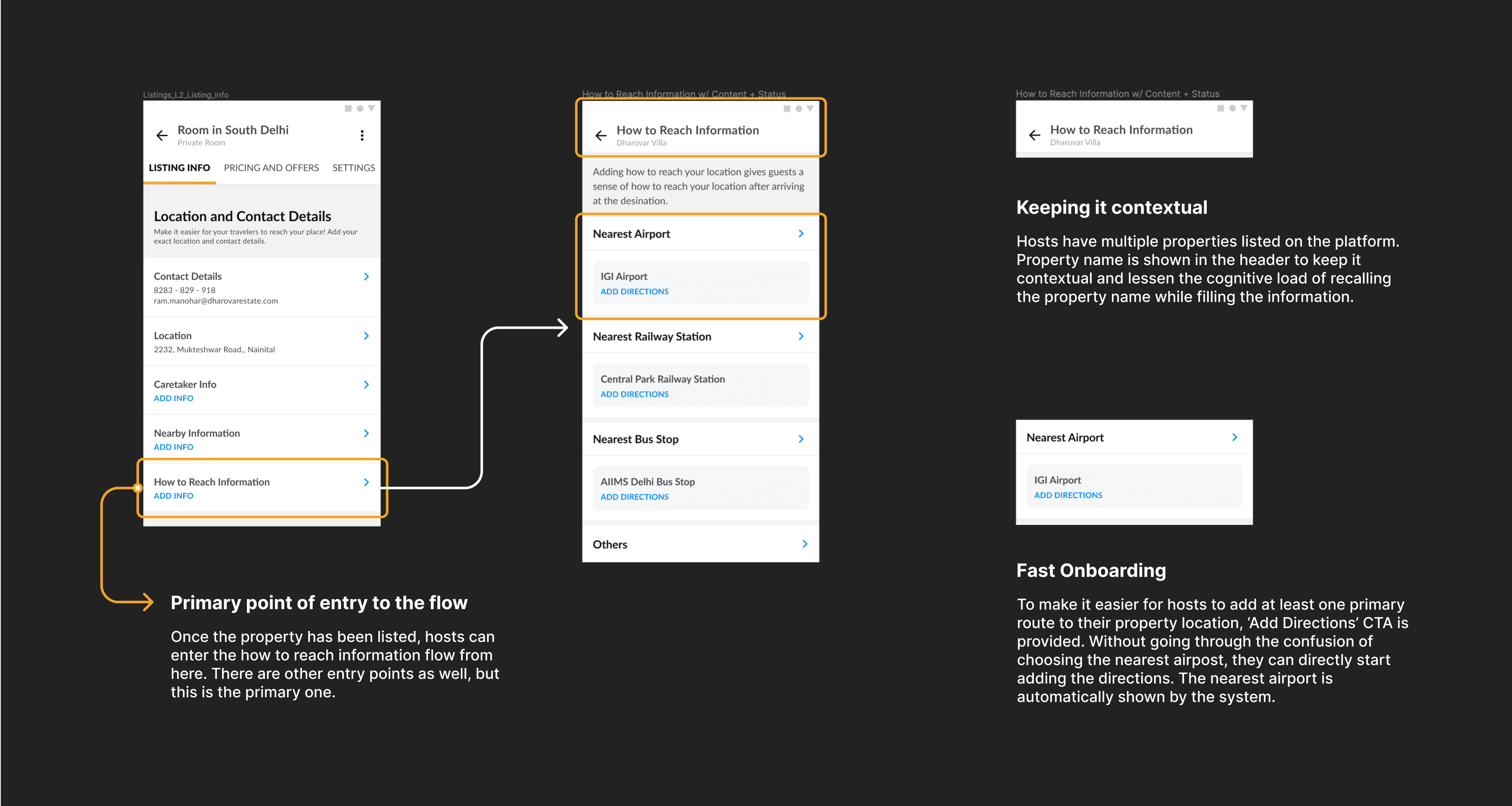 In this case study, I have described my process of designing the ‘How to Reach’ flow for the ingo-MMT host app. The ‘How to Reach’ flow was designed to enable hosts to add property direction information easily and accurately. This information is reflected in the funnel products which in turn helps the visitors to find the way to their booked homestays. This is one of the projects that I worked on during my internship at MakeMyTrip.